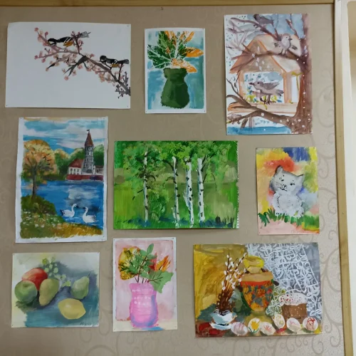.02.12.2023 Для гостей в холле 1 этажа оформлена выставка работ, которые выполнили учащиеся под руководством педагогов на занятиях по кратковременным дополнительным общеразвивающим программам «Россия глазами детей» (педагог дополнительного образования Пахомова Е.С.) и «Я люблю Россию» (педагог дополнительного образования Бегун Т.А)